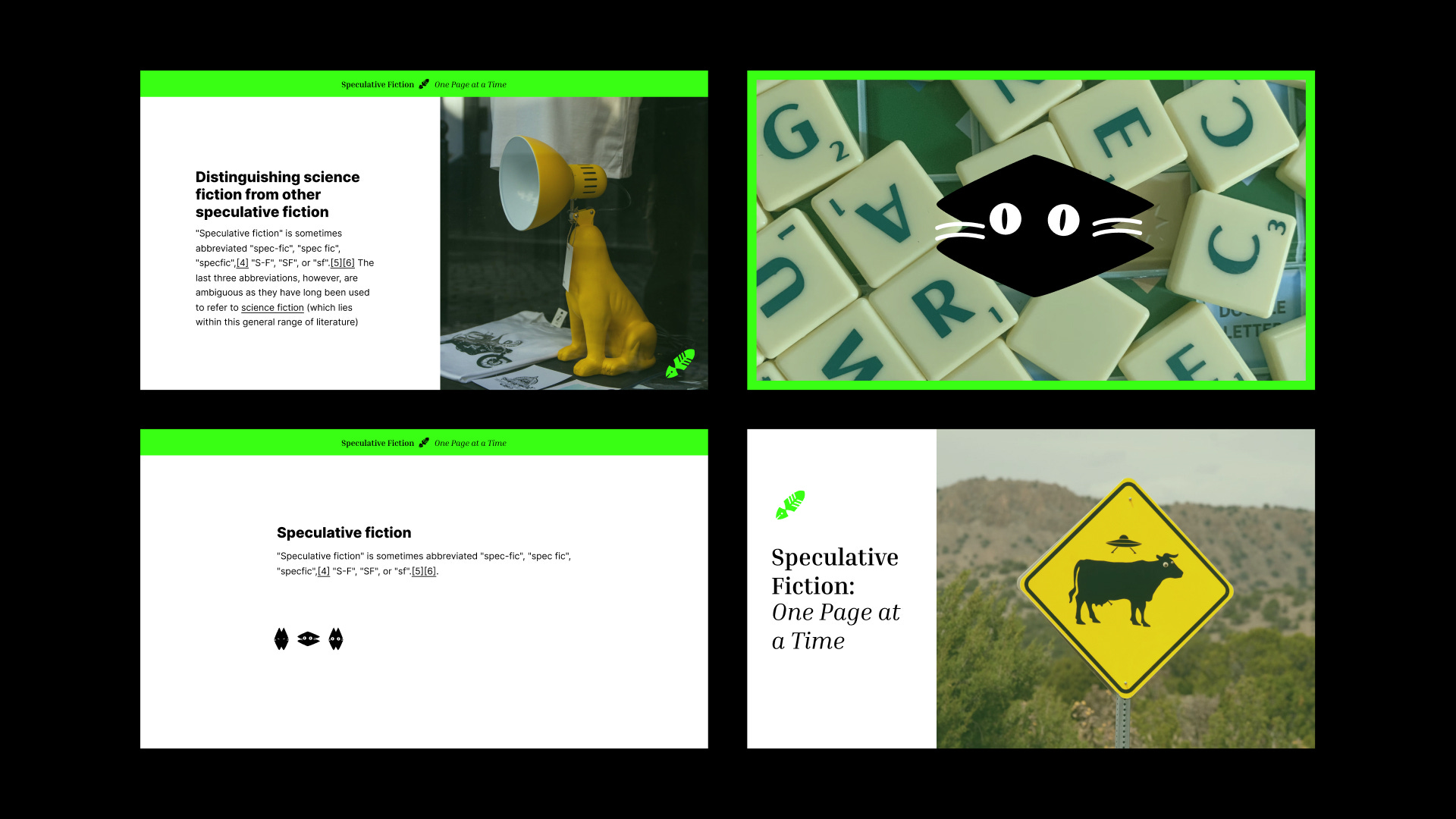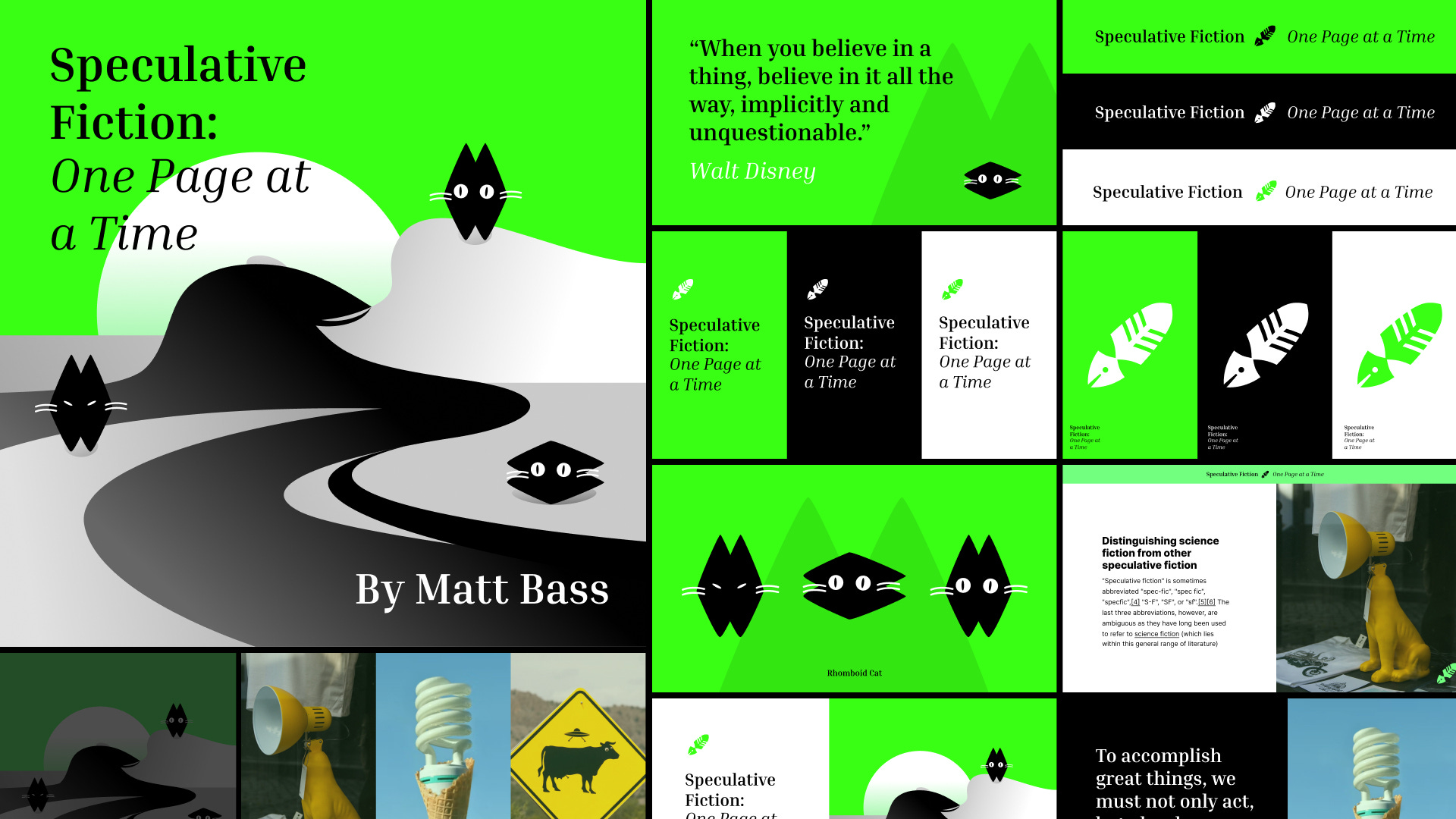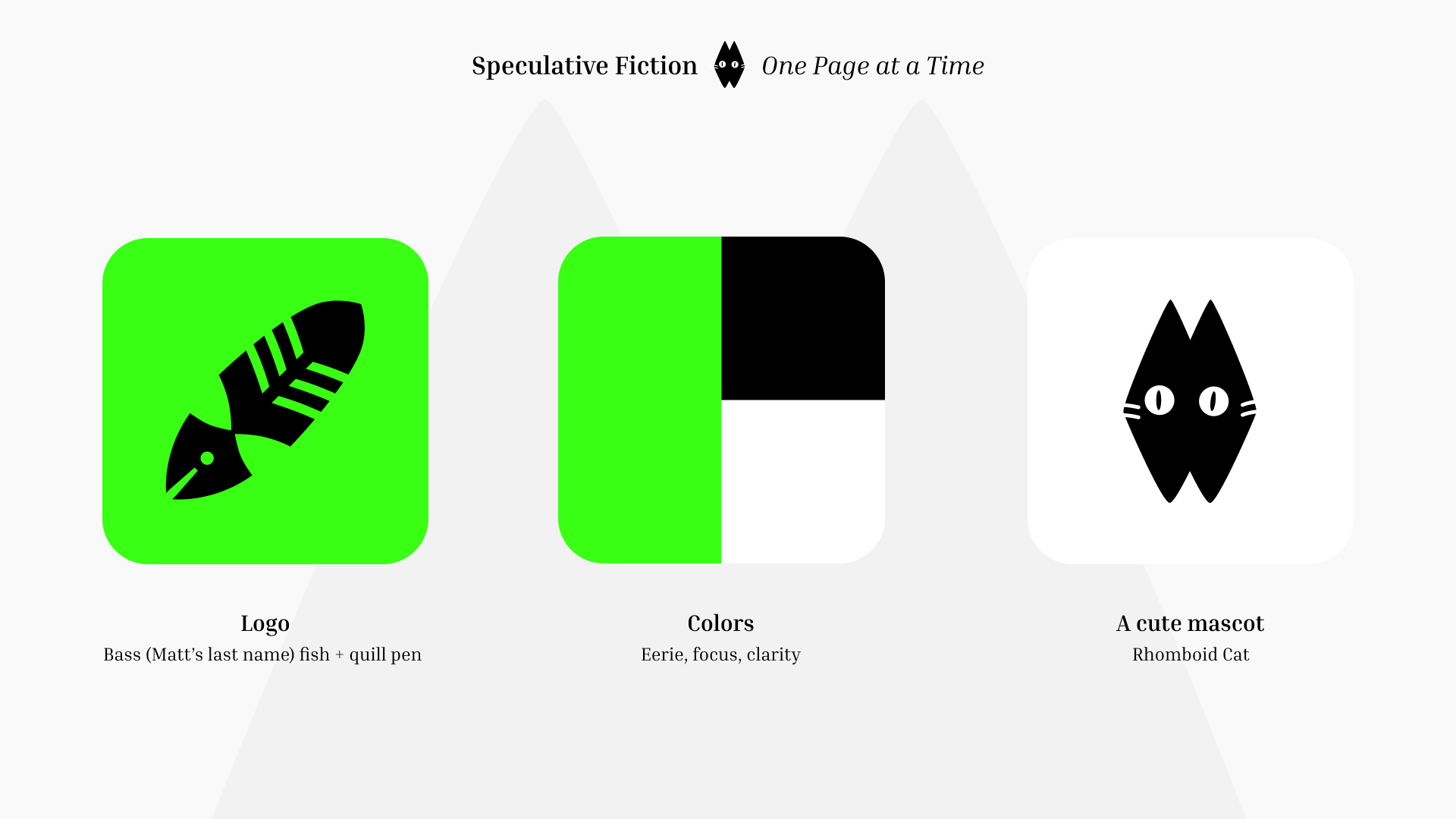 The brand illustration reflects his personality and communicates his vision for his publication. I wanted the core illustration to highlight the “intriguing but weird” aspects of Speculative Fiction.